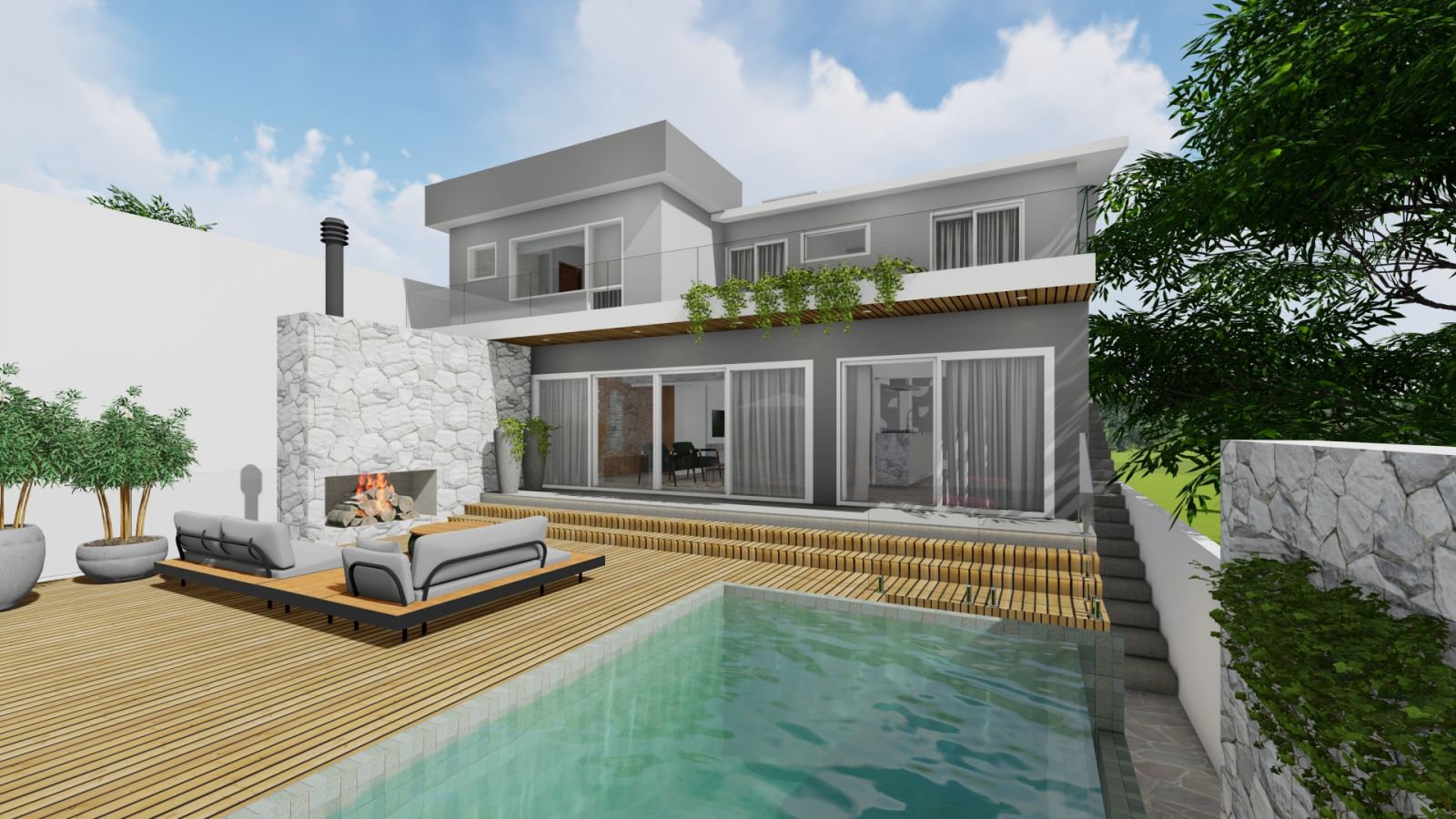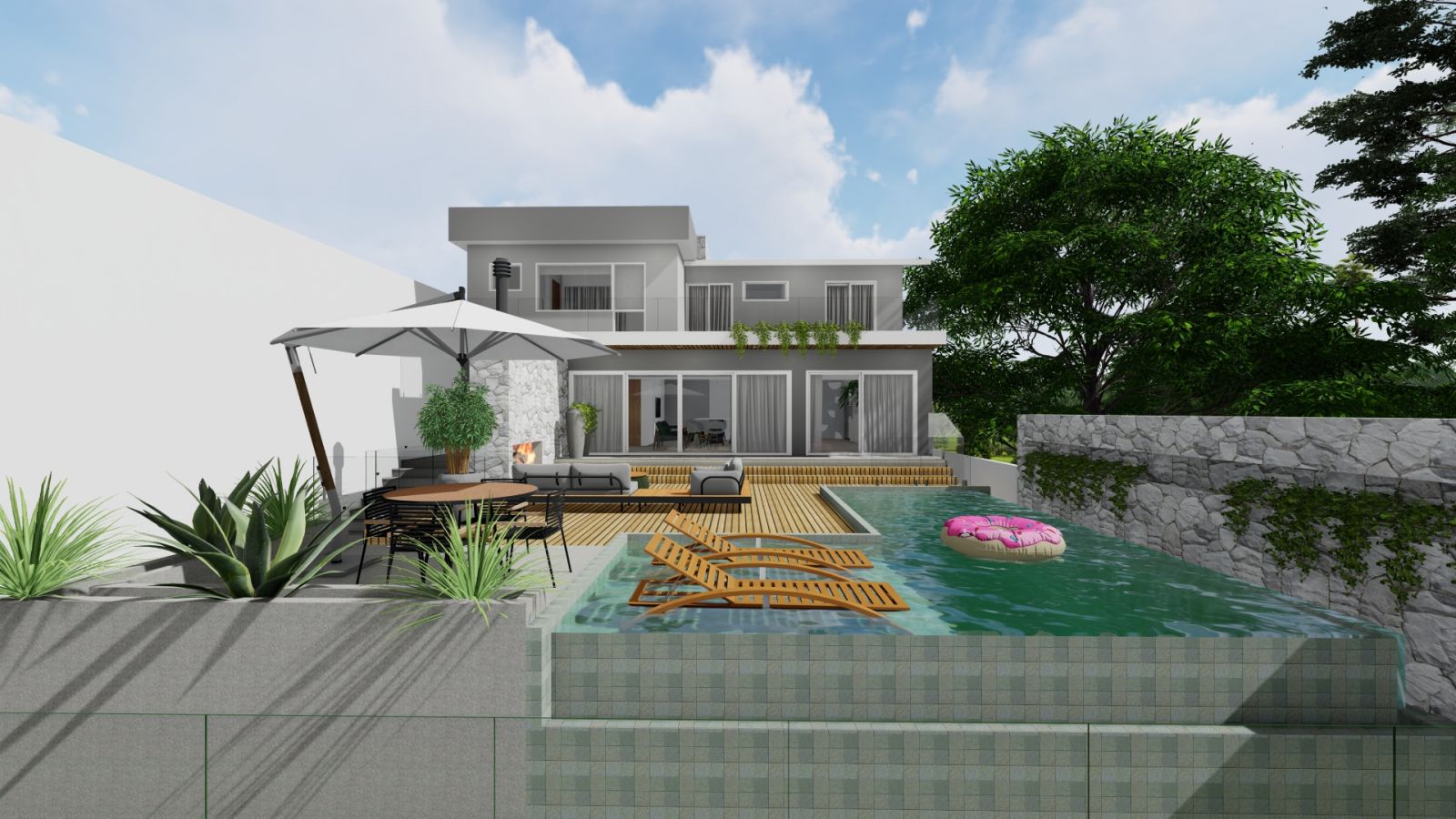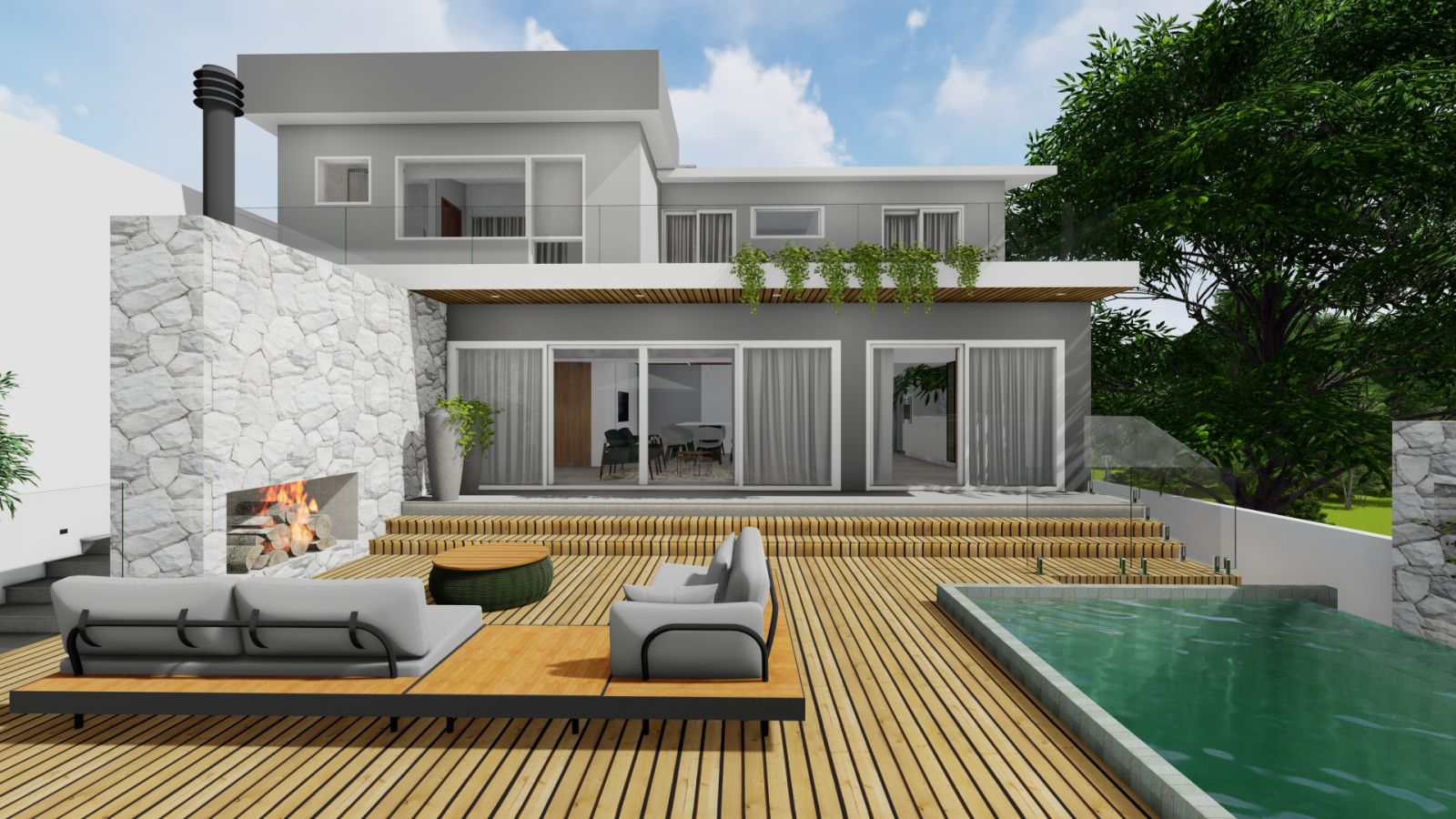 Nos fundos um deck suspenso com piscina de borda infinita, uma lareira construída ao ar livre, vegetações, revestimentos e pintura.
