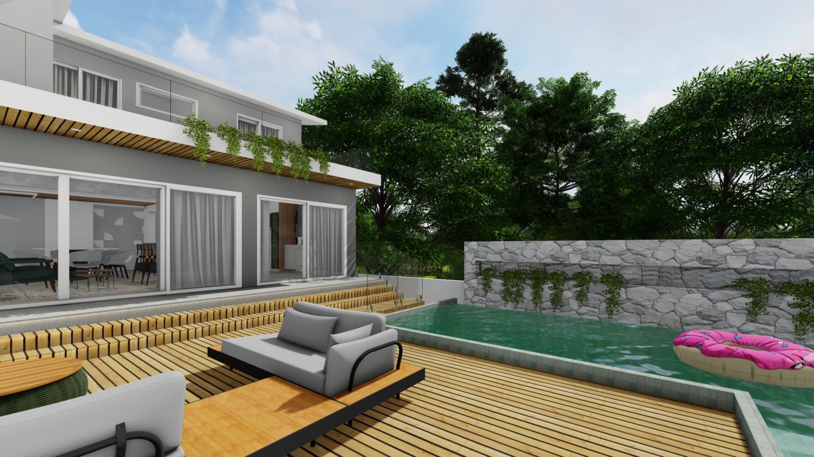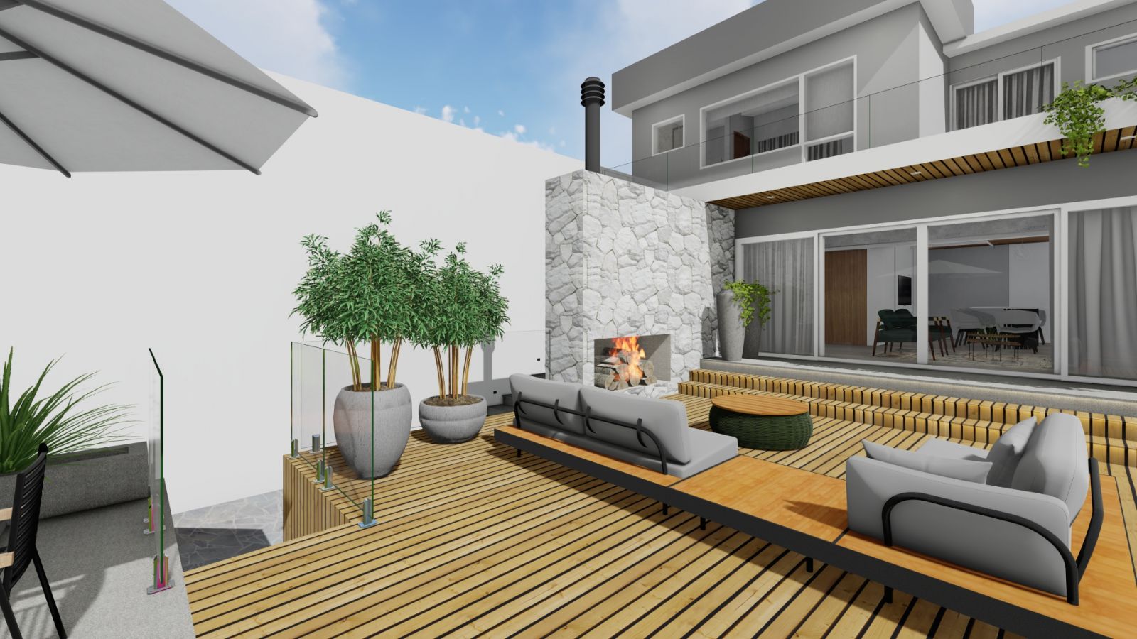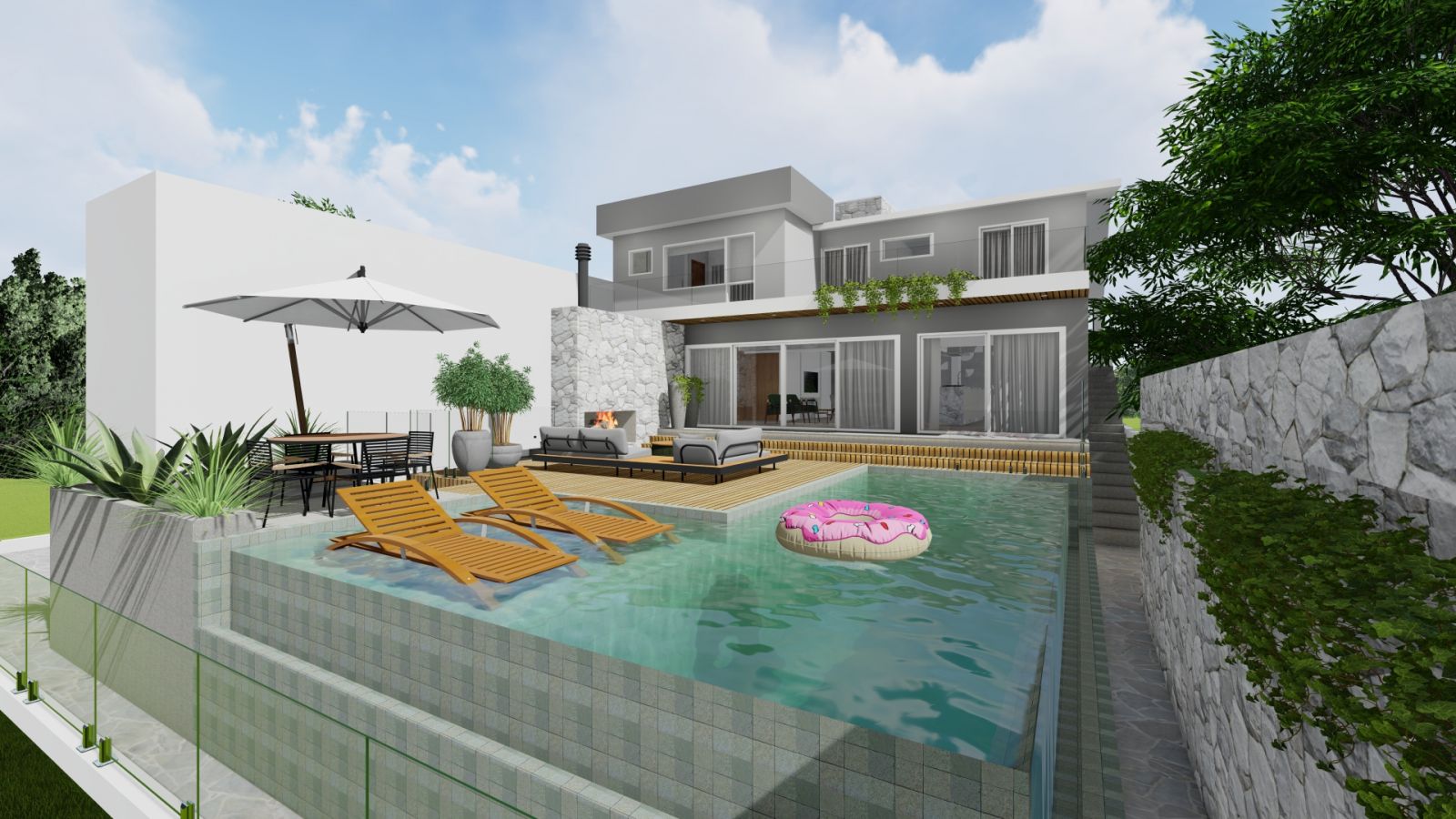 Nos fundos um deck suspenso com piscina de borda infinita, uma lareira construída ao ar livre, vegetações, revestimentos e pintura.